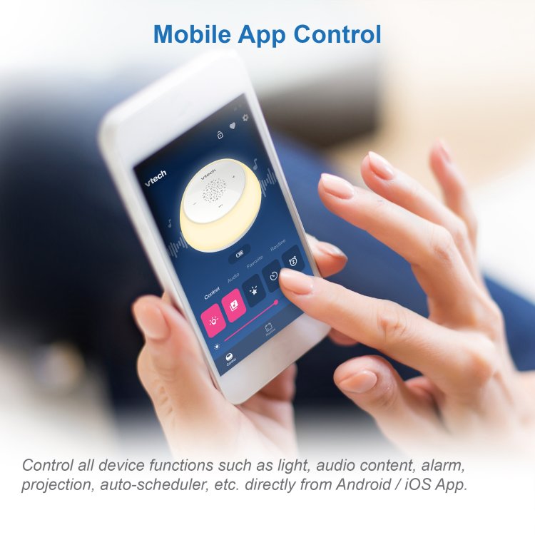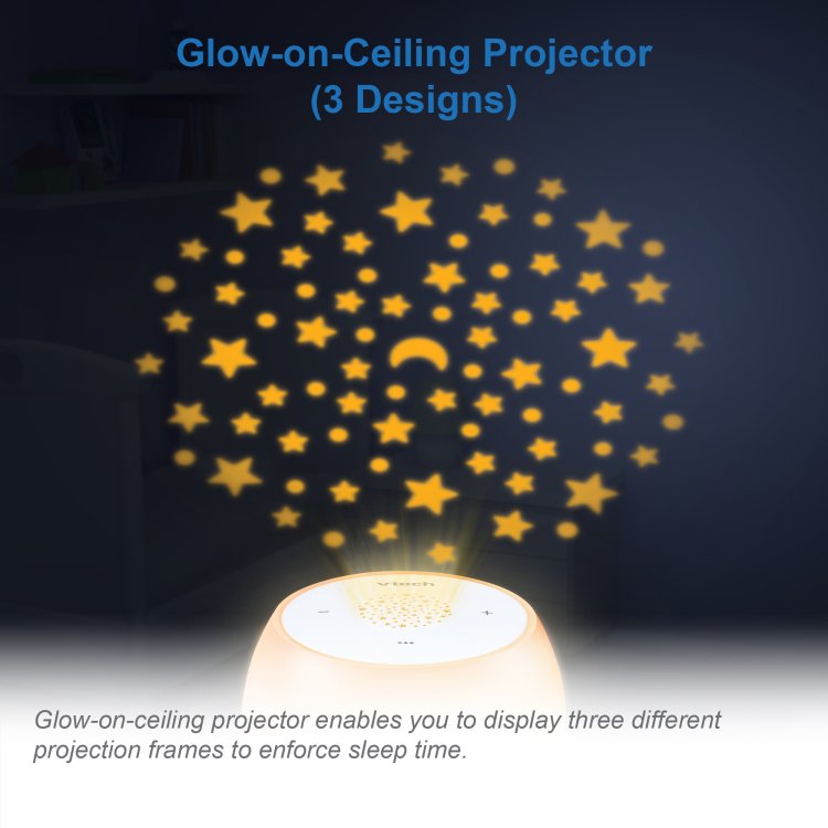 One-touch night light offers over 250 colour choices, Glow-on-ceiling projector, Pre-programmed with 10 stories, 10 classical tunes, 10 lullabies, and 10 natural sounds, Professional sleep training program by Apps, Record and upload your own voice, 2600mah rechargeable battery support up to 8-12 hours of use.