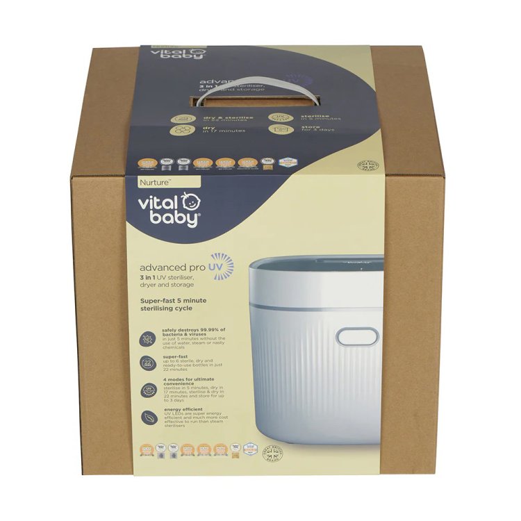 The all-new Vital Baby Advanced Pro UV Steriliser & Dryer is now faster and more efficient than ever. With more germ-busting UV LEDs, it delivers a super-fast sterilisation cycle in just 5 minutes, or a combined sterilise and dry cycle in only 22 minutes.