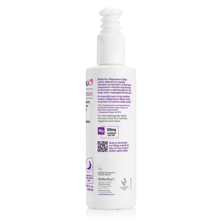 BetterYou Magnesium Sleep Lotion delivers an expertly blended magnesium supplement - made with a combination of magnesium chloride and essential oils of lavender and chamomile.