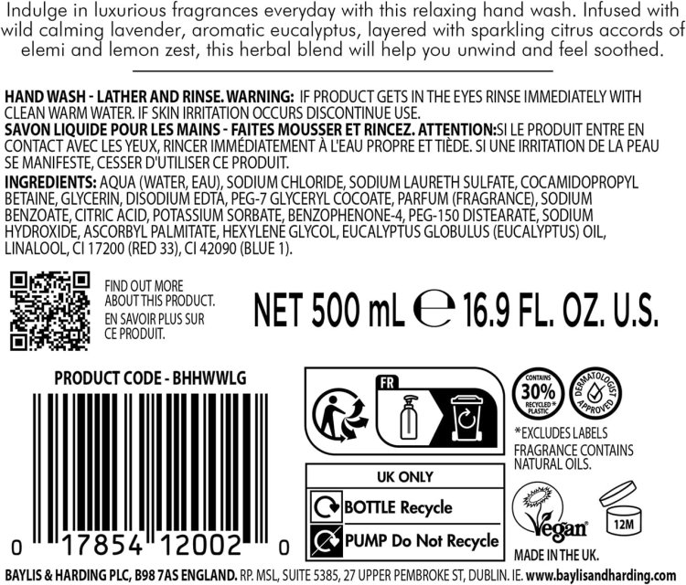 | Ingredients | AQUA (WATER, EAU), SODIUM CHLORIDE, SODIUM LAURETH SULFATE, COCAMIDOPROPYL BETAINE, GLYCERIN, DISODIUM EDTA, PEG-7 GLYCERYL COCOATE, PARFUM (FRAGRANCE), SODIUM BENZOATE, CITRIC ACID, POTASSIUM SORBATE, BENZOPHENONE-4, PEG-150 DISTEARATE, SODIUM HYDROXIDE, ASCORBYL PALMITATE, HEXYLENE GLYCOL, CI 17200 (RED 33), CI 42090 (BLUE 1), EUCALYPTUS GLOBULUS OIL, LINALOOL. |