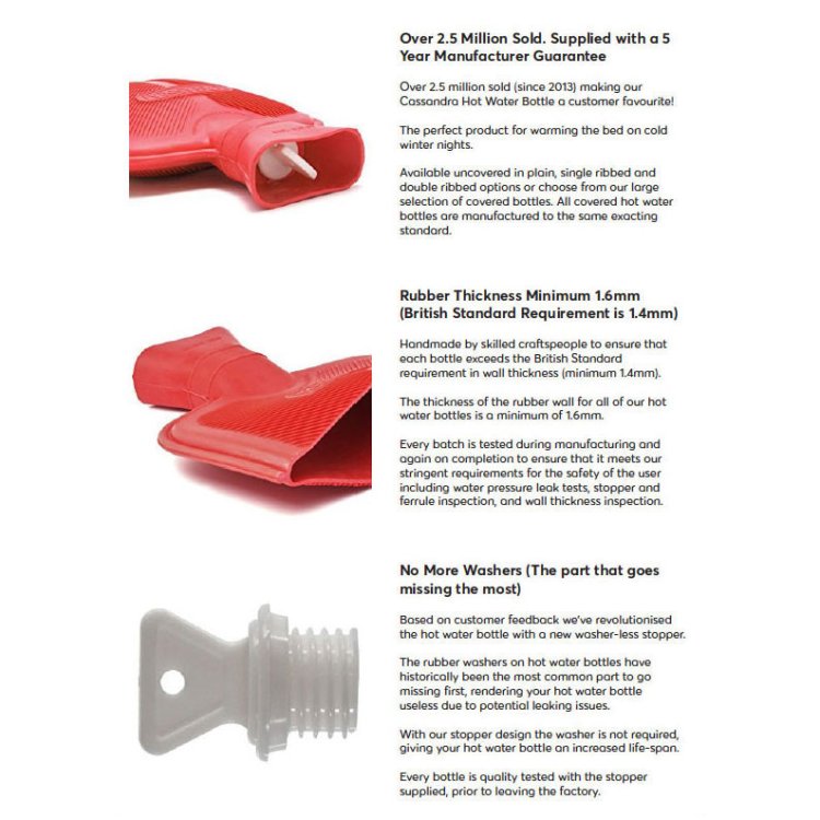 When using a Cassandra back opening cover with this bottle, always place the opening of the cover face down if using in a bed. Always ensure that the cover is completely closed with the hook and loop fixings before use, to prevent the bottle becoming exposed. Even when using the bottle with a cover you should take precautions not to have direct prolonged contact with the same area of skin.