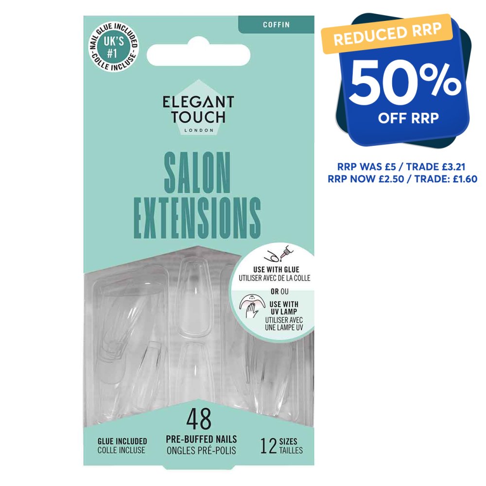 Take your manicure game to the next level with Elegant Touch Salon Extensions in a classic coffin shape. Whether you love the flexibility of gel with a curing lamp or prefer quick-and-easy glue, these pre-buffed nails offer the ultimate hold and versatility. With a high-gloss finish, salon-sculpted fit, and medium length, theyโre your blank canvas for custom nail art, bold colours, or effortless minimalism.