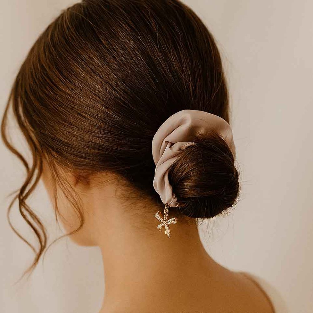 Crafted from sleek satin fabric, this scrunchie exudes luxury and sophistication. The highlight of this accessory is the dazzling diamante charm delicately suspended on a gold chain, adding a touch of glamour to any hairstyle. Available in a variety of colours, you can choose the perfect shade to complement your outfit or mood.