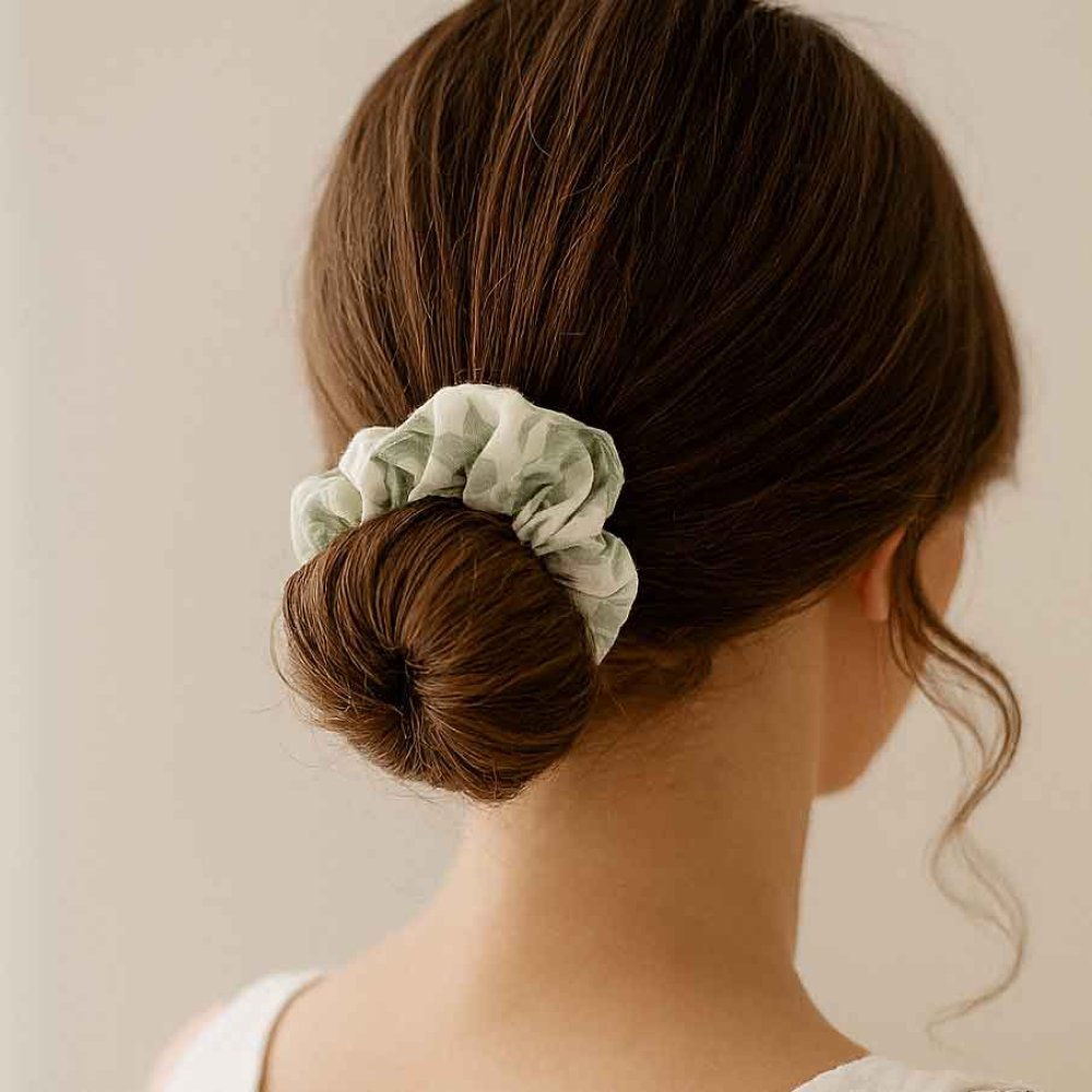 This pack includes 2 skinny scrunchies and 1 chunky scrunchie, providing versatile options for different hair thicknesses and styles. Crafted from soft sage-coloured patterned fabric, these scrunchies offer a subtle yet stylish accent to your hairdo. Whether you're dressing up for a special occasion or adding flair to your everyday look, these scrunchies are perfect for creating effortless hairstyles.