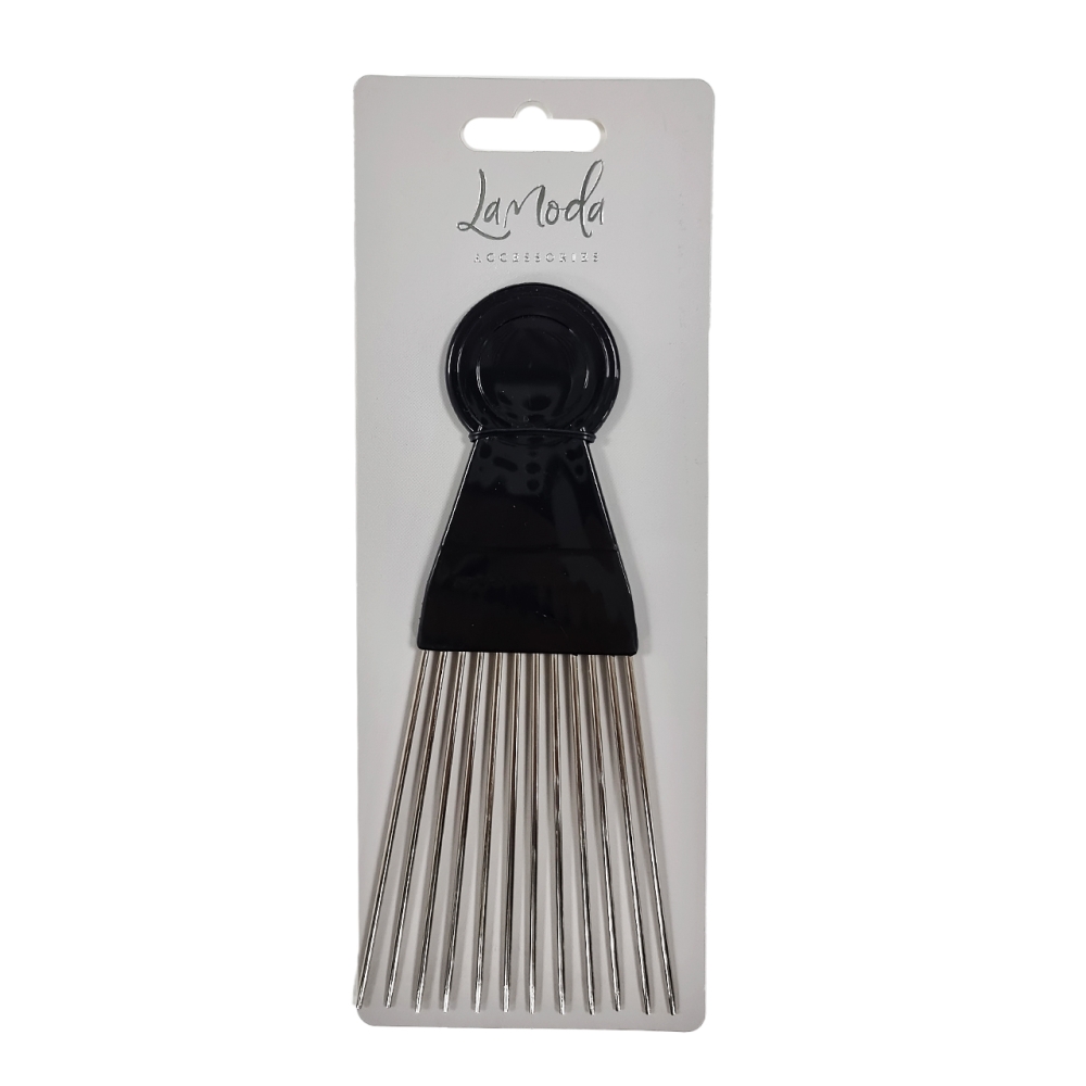 The LaModa Metal Pick Afro Comb is designed to effortlessly style and detangle afro-textured hair. Featuring long, sturdy metal picks, this comb glides through your hair with ease, helping to separate and lift curls for a voluminous, natural look. The easy-to-hold black plastic handle provides a comfortable grip, making it simple to use for everyday styling. Ideal for both detangling and adding volume, this comb is an essential tool for maintaining and enhancing curly and textured hair.