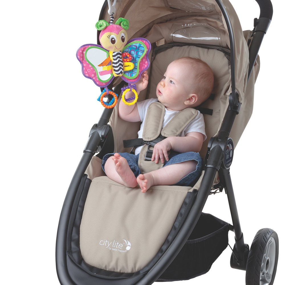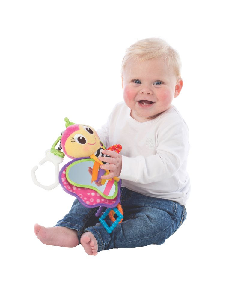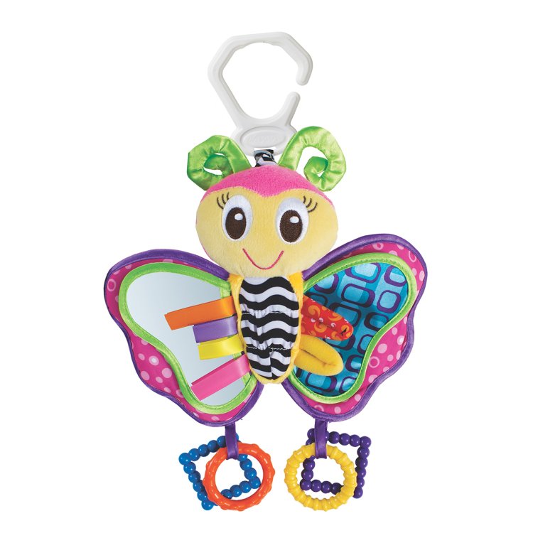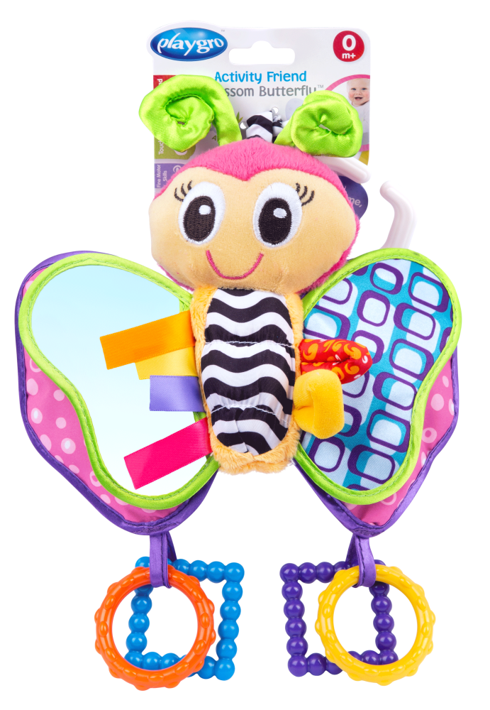 Meet the cute and delightful Blossom Butterfly! With a range of colours and textures for visual and tactile development. Blossom Butterfly has crinkle sounds in the wings, an added mirror feature for fun peek-a-boo play, plastic hanging rings and a whistling sound when butterfly bounces.