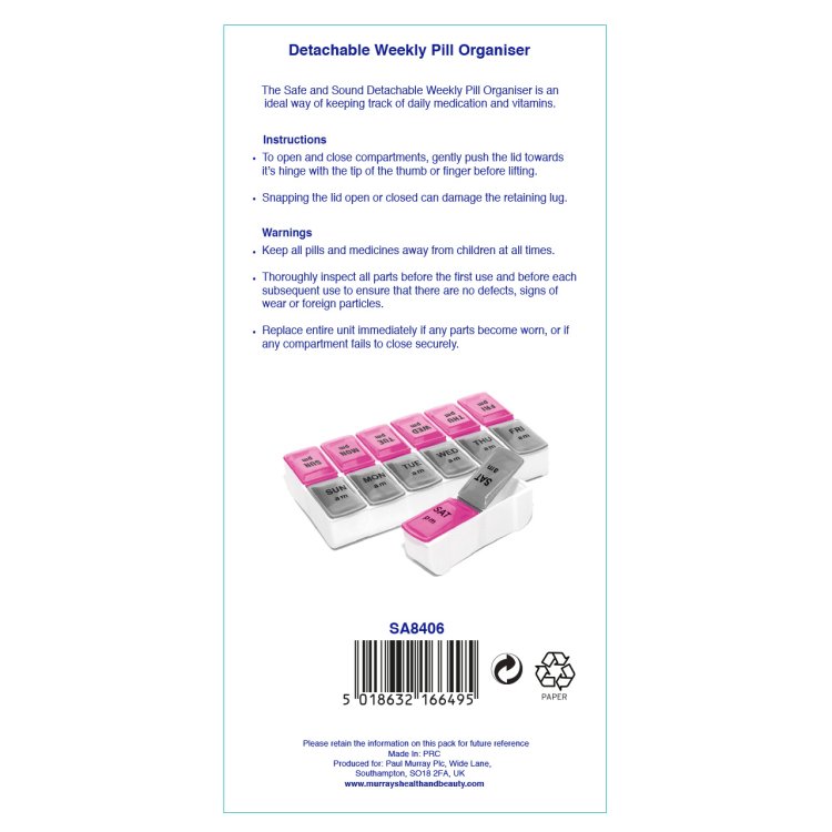 Stay on top of your medication schedule with this organiser designed for convenience and flexibility. Featuring separate AM and PM compartments for each day of the week, its detachable daily sections make it easy to manage your routine both at home and on the go.