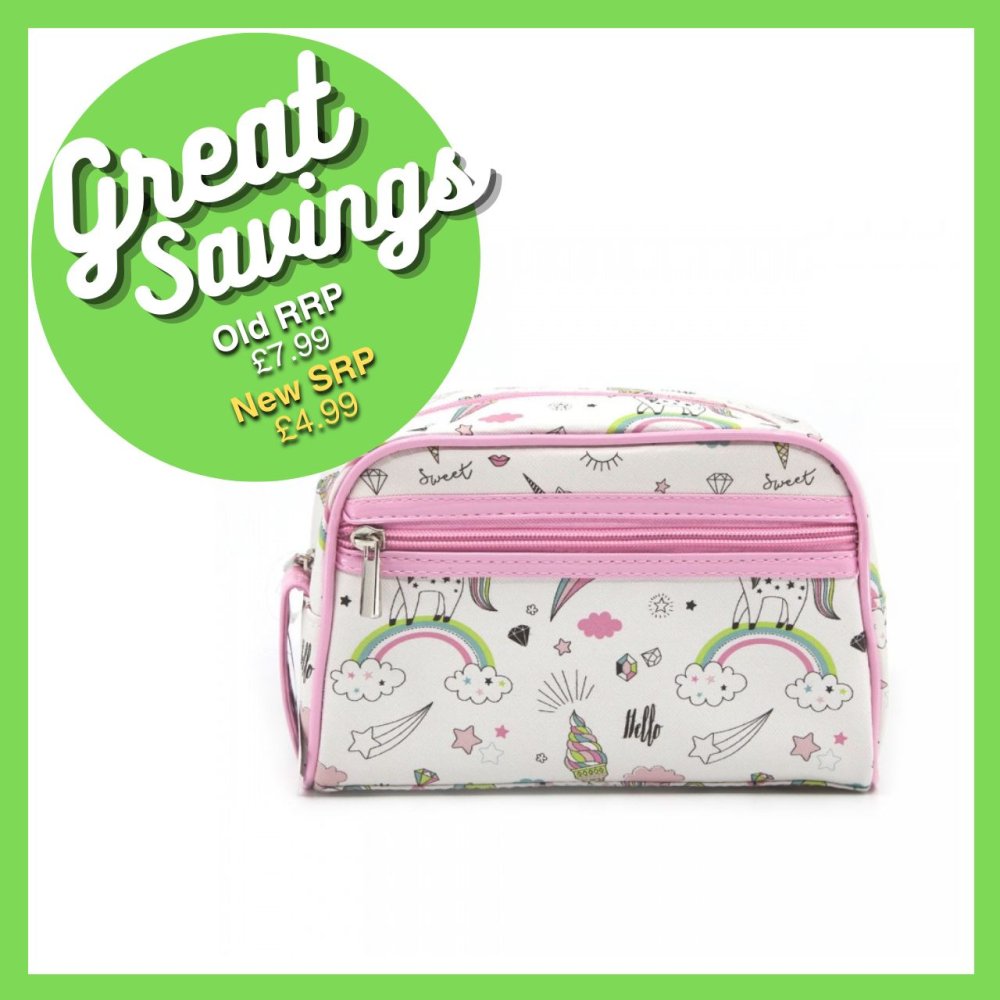 Introducing the Medium Cosmetics Bag from Sanjo's Unicorn range - a magical and whimsical accessory for your beauty essentials. This enchanting bag features a delightful unicorn pattern adorned with rainbows and stars, set against a white background with charming pink accents.