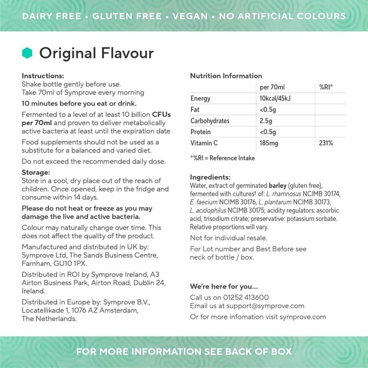 Symprove is backed by over 15 years of independent scientific research. In one of our studies, University College London showed that our water-based solution was the only live bacteria product to make it to the gut alive. The live and active bacteria in your 70ml shot of Symprove: