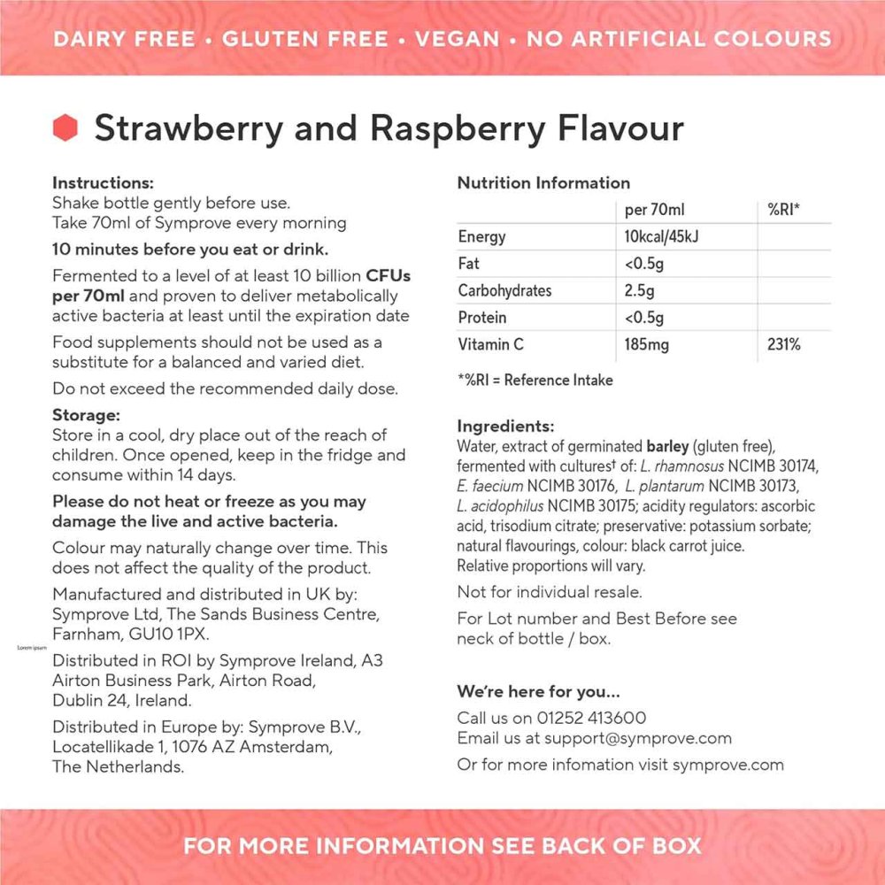 Our Strawberry & Raspberry Symprove is a bright, berry-flavoured, water-based supplement designed to support gut health with live and active bacteria. Unlike other probiotics, it’s scientifically proven to deliver bacteria directly to your gut, helping to balance your microbiome and enhance overall well-being.