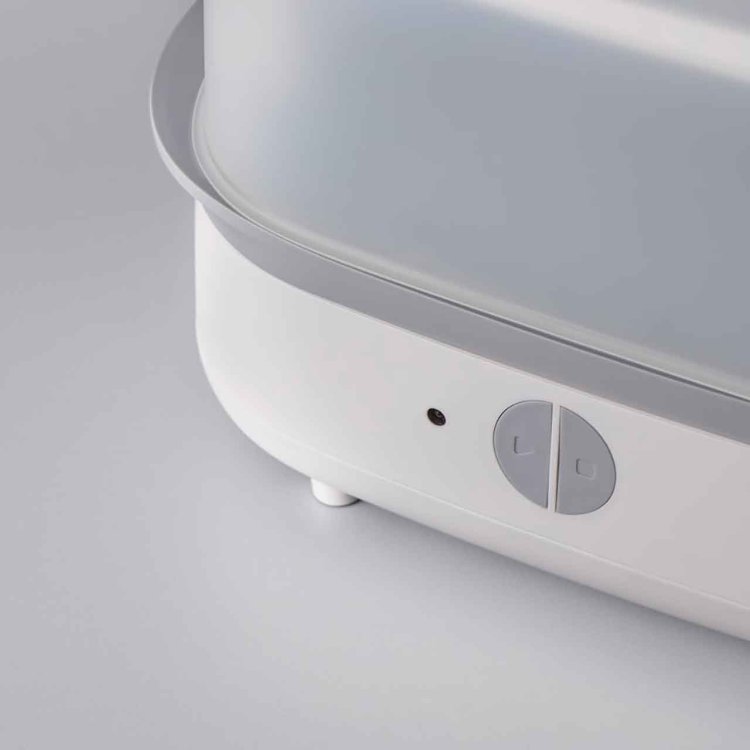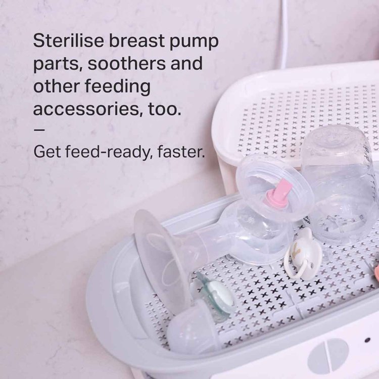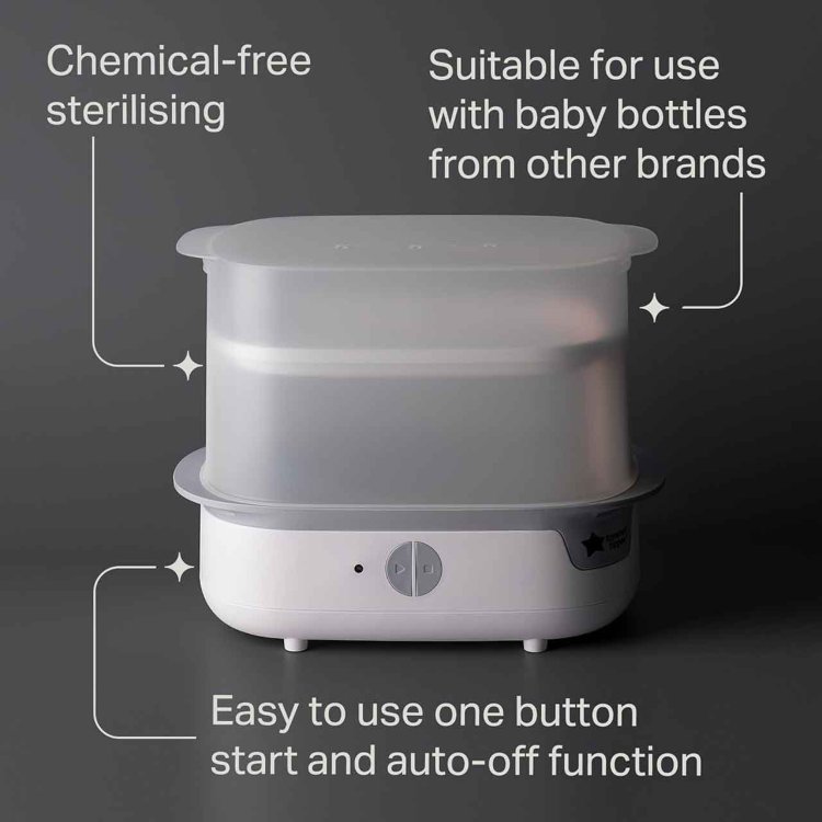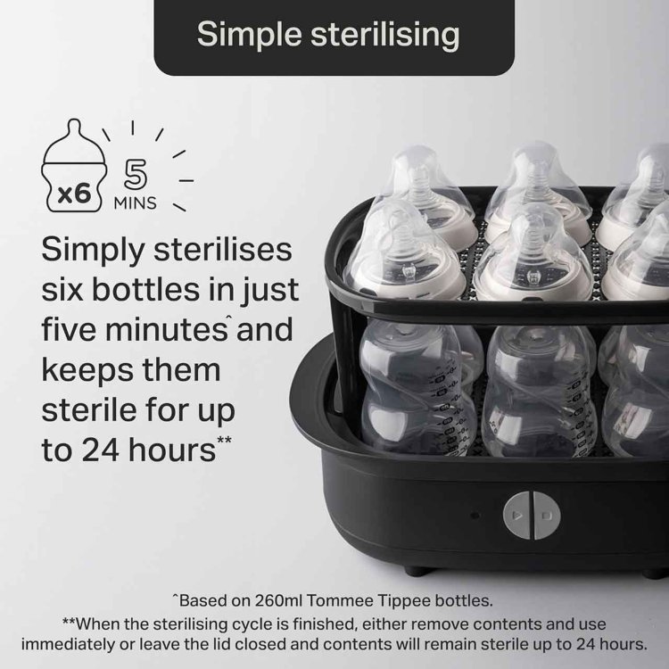 This steriliser fits six 260ml Tommee Tippee bottles and also works with breast pump parts, soothers, and feeding accessories. After sterilising, keep the lid closed to maintain sterility for up to 24 hours**. Its simple one-button start and auto-off function make it easy to use.