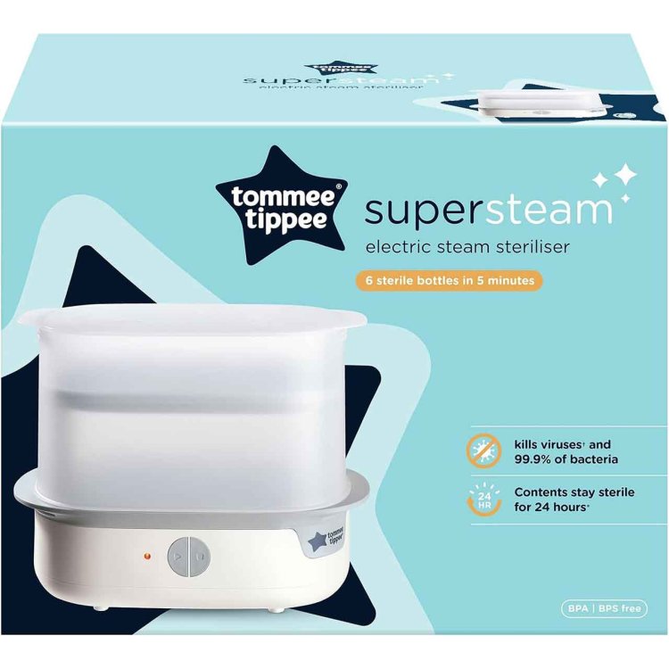 Sterilise your baby’s bottles and accessories quickly and naturally with the Tommee Tippee Supersteam Electric Steam Steriliser. Using 100% natural steam, it kills viruses* and 99.9% of harmful bacteria in just 5 minutes^—so you can spend more time with your little one.