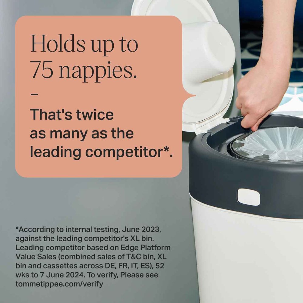 The XL bin holds up to 75 nappies*** — that’s twice as many as the leading competitor — so you make fewer trips to the outside bin. With a tall, slim design, it fits neatly in your nursery, and the smart sealing lid with inbuilt plunger ensures clean, one-handed disposal every time.