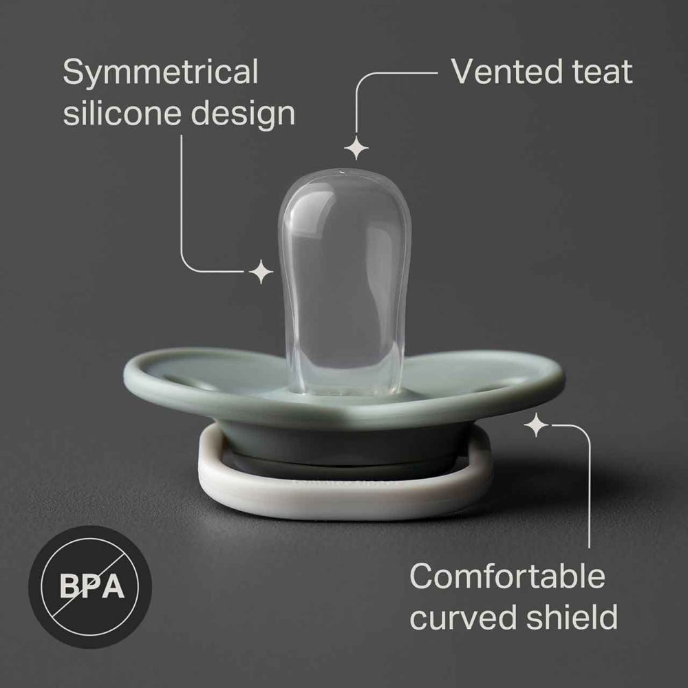 Simple and timeless, these soothers are designed to provide calm and comfort wherever you are. The symmetrical silicone teat always sits the right way up, making it fuss-free for your baby.