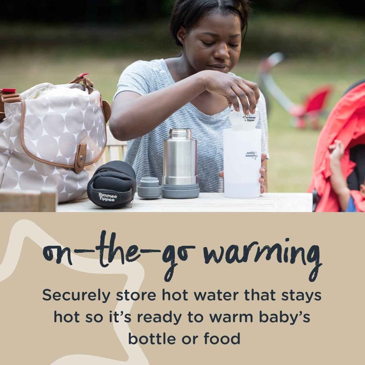 Warm your baby’s feed wherever you are with the Tommee Tippee Portable Travel Baby Bottle & Food Warmer. The stainless steel thermal flask stores hot water, ready to warm baby bottles or food jars on the go—without the need for electricity.