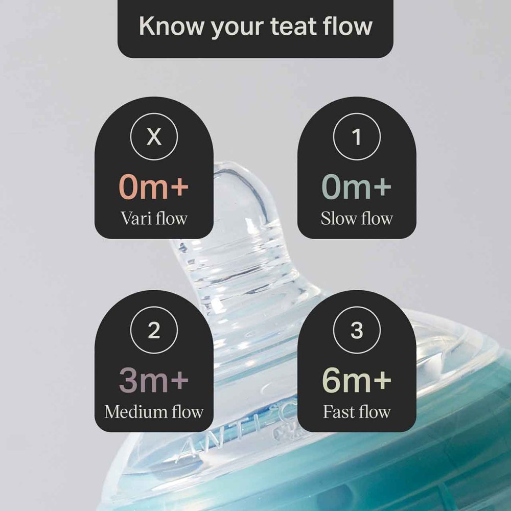 We offer different flow rates to keep up with your growing baby. Every baby is different but as a guide we suggest slow flow for 0+months, medium flow for 3+ months and fast flow for 6+ months. Advanced Anti-Colic teats are only compatible with Advanced Anti-Colic bottles.