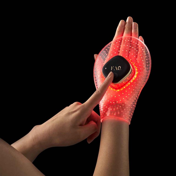 Start with clean and dry skin. Then, place your FAQ™ 221 LED Mask on the back of your hand. Secure in place with the gold wrist chain.