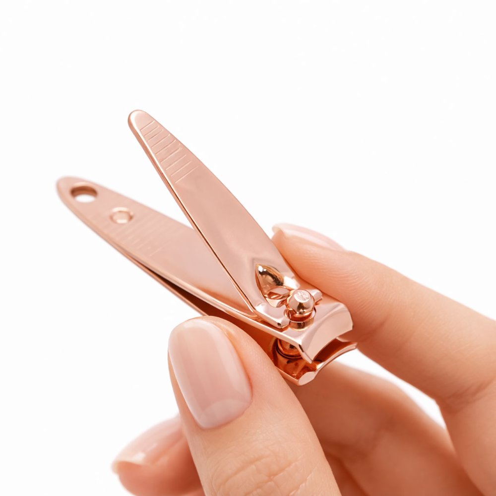 Lift up and rotate the lever of the clippers. When you are ready to trim your nails, hold the clippers in your hand. Place a fingernail between the two cutting blades that face each other. Squeeze the upper lever and the lower parts together to clip the edge of the nail off.