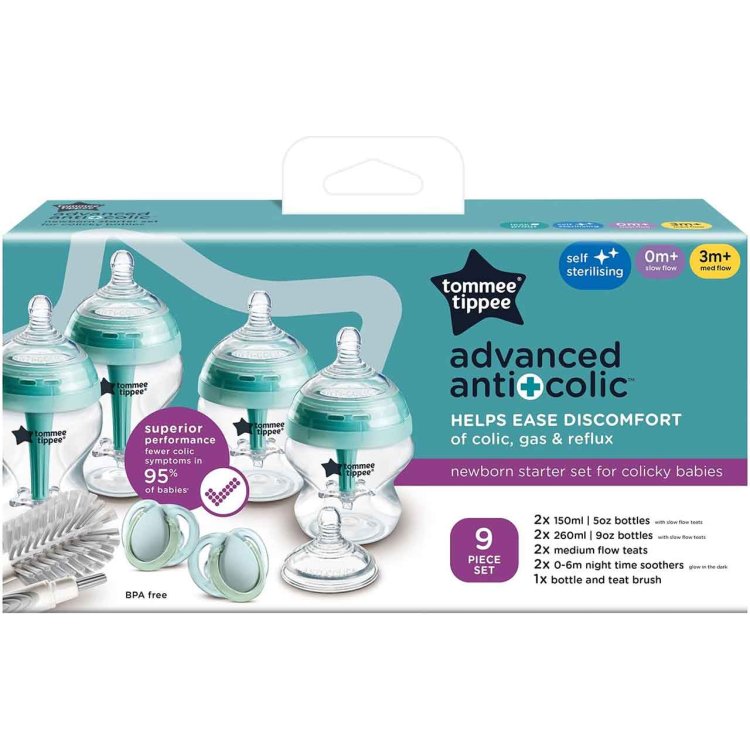 Tommee Tippee Advanced Anti-Colic Newborn Starter Set | 150ml & 260ml Bottles | Self-Sterilising with Vented Wand | 2x Medium Flow Breast-Like Teats | Reduces Colic, Gas and Reflux