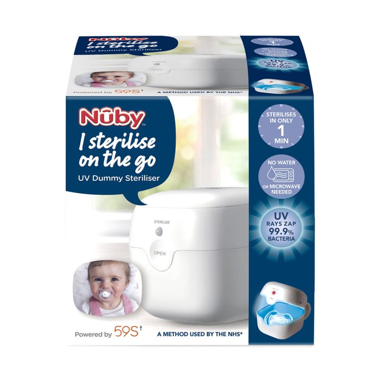 Say goodbye to stressy dummy sterilisation with the award-winning Nuby UV Soother Pod. Compact and portable, this innovative mini steriliser kills 99.9% of bacteria in just 1 minute — no water, no microwave, no chemicals, no cooling time. Simply pop in your dummy, close the lid, and let the UV light do the rest.