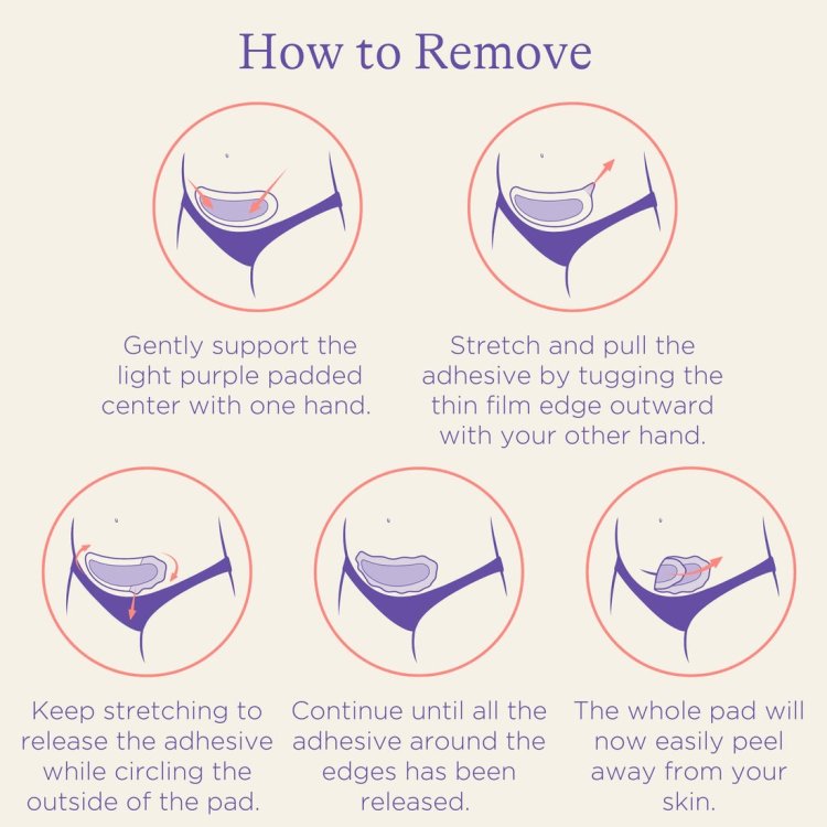 To remove, hold the centre of the pad and gently pull the pad edge outward to release the adhesive. Continue to pull the edge, stretching outward (not upward) and in the same direction of any hair growth.