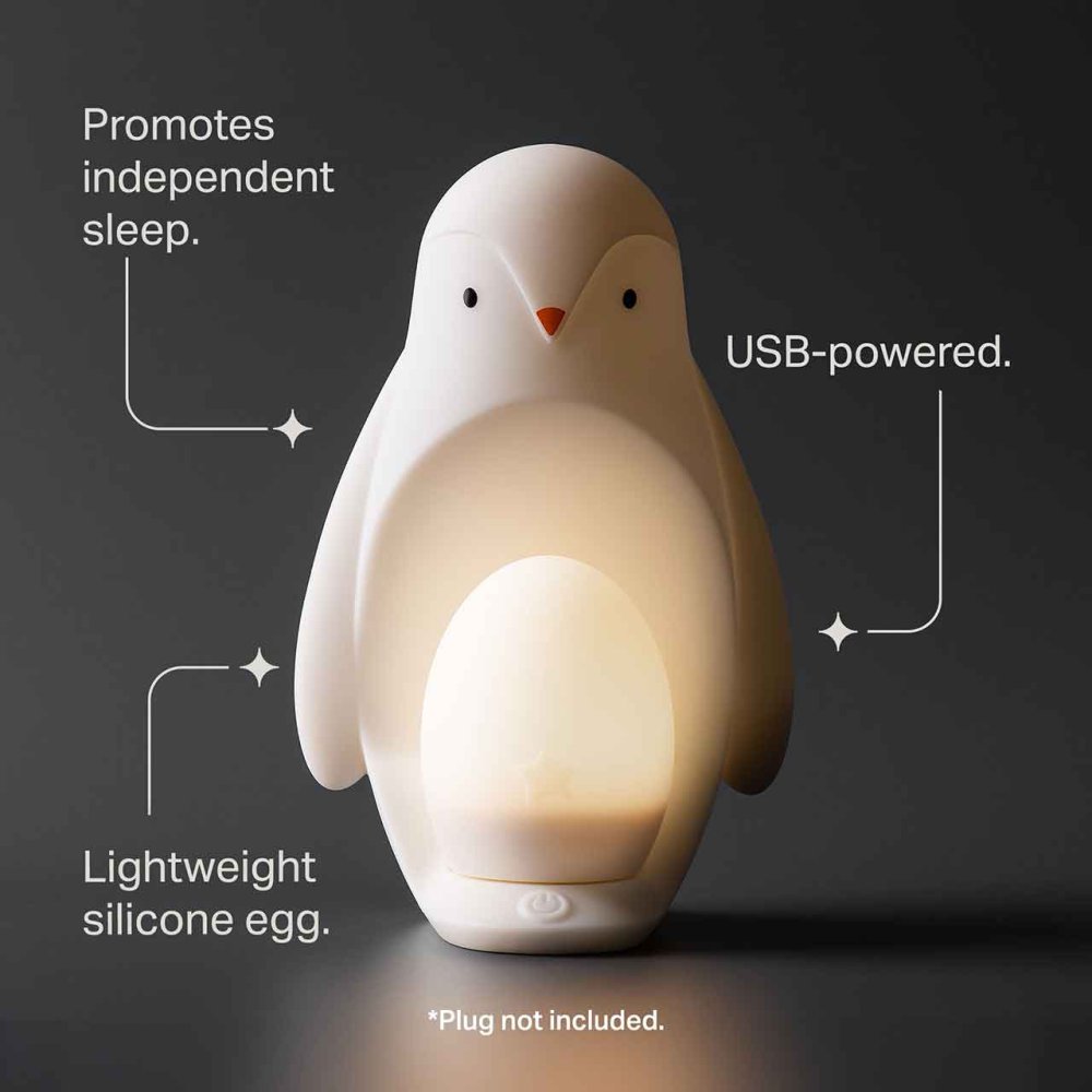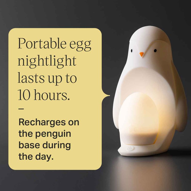 This charming 2-in-1 nursery night light is designed to comfort your little one from birth through toddlerhood. The soft, tactile penguin base holds a detachable, glowing egg light thatβs perfectly sized for small hands to carry. The portable egg lasts up to 10 hours on a full charge and recharges effortlessly on the penguin base during the day.