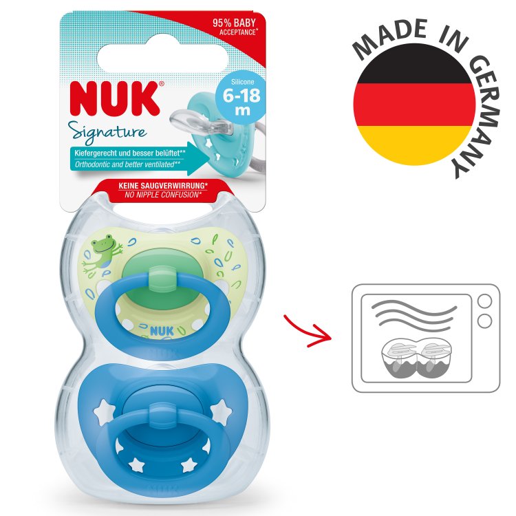 Offering quality from the very start, NUK Signature Soothers continue a tradition of trusted comfort for generations. Designed naturally to suit the jaw, these soothers feature the improved NUK original shape modelled on a mother’s nipple during breastfeeding, fitting perfectly into your baby’s mouth.
