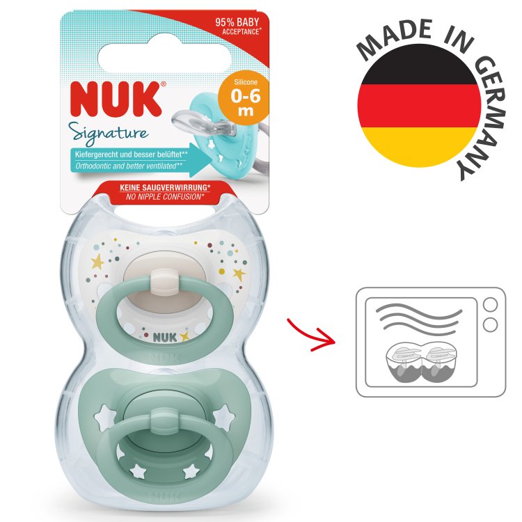 The classic choice for soothing comfort, NUK Signature Soothers combine timeless design with modern quality. Shaped to mimic a mother’s nipple during breastfeeding, the improved teat fits perfectly in your baby’s mouth, supporting natural sucking and promoting healthy jaw development.