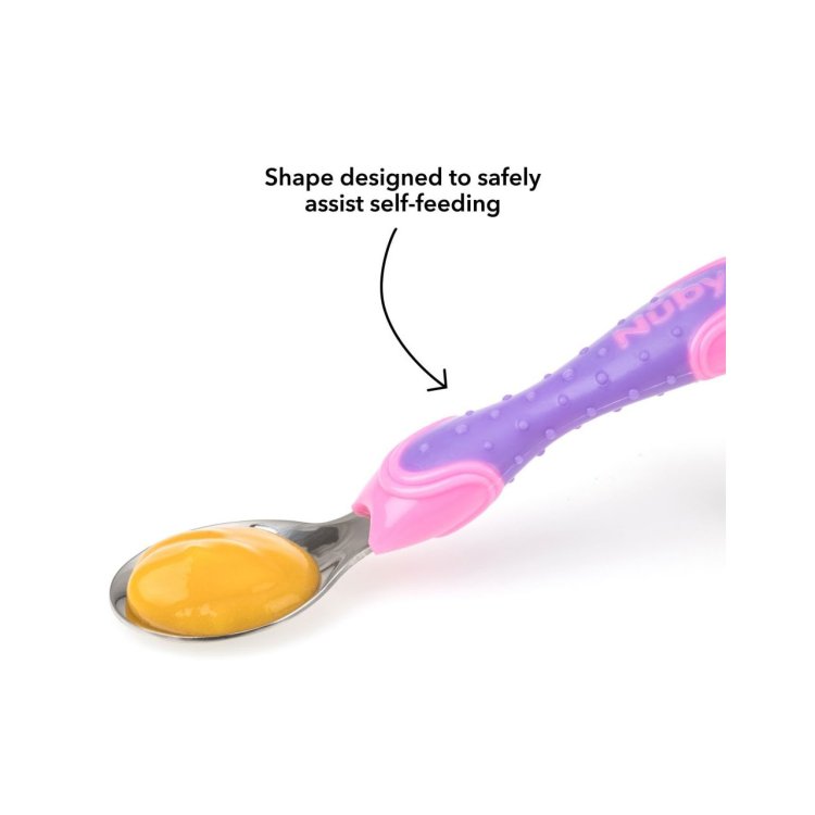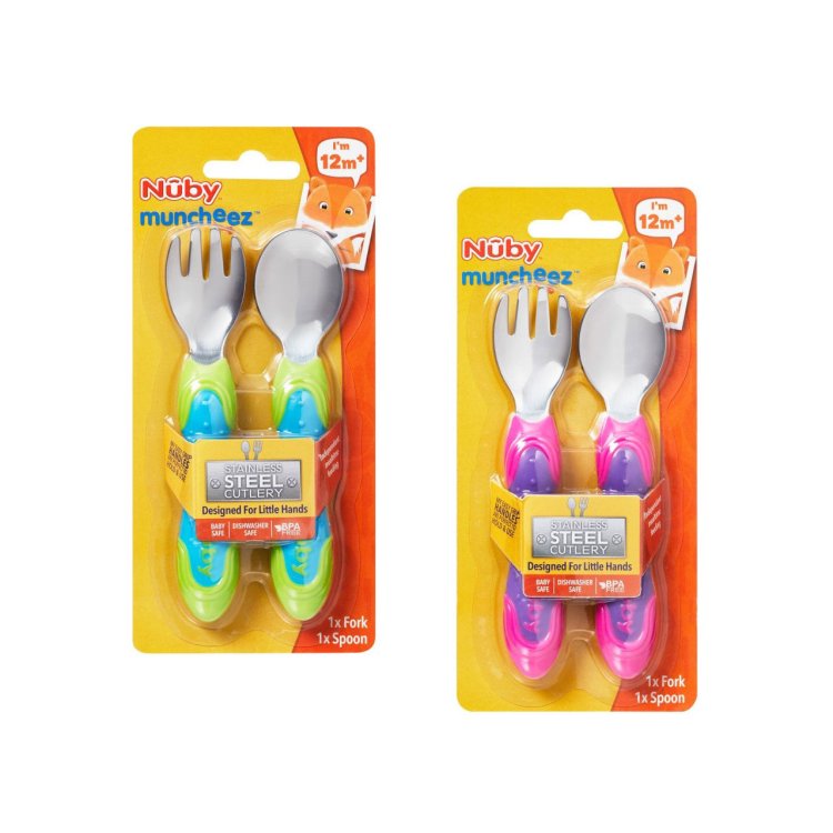 Stainless Steel Cutlery Set. Let little hands get to grips with this Stainless Steel Cutlery duo designed to help your baby on their way to independent feeding. Little hands will love getting to grips with this Stainless Steel Cutlery duo (including a fork and a spoon), are designed to safely assist your baby as they continue learning to self feed. With a bit of practice, they’ll be well on their way to independent feeding and good eating habits in no time. The brightly coloured, Easy Grip handles and the fork and spoon themslves are perfectly shaped and sized for little hands to hold and use so they’ll feel all grown up as they start to master their new skills. Easy to clean, this set can either be washed in warm soapy water and rinsed or used in the dishwasher for convenience saving you time until they’re old enough to get those dishes done themselves!