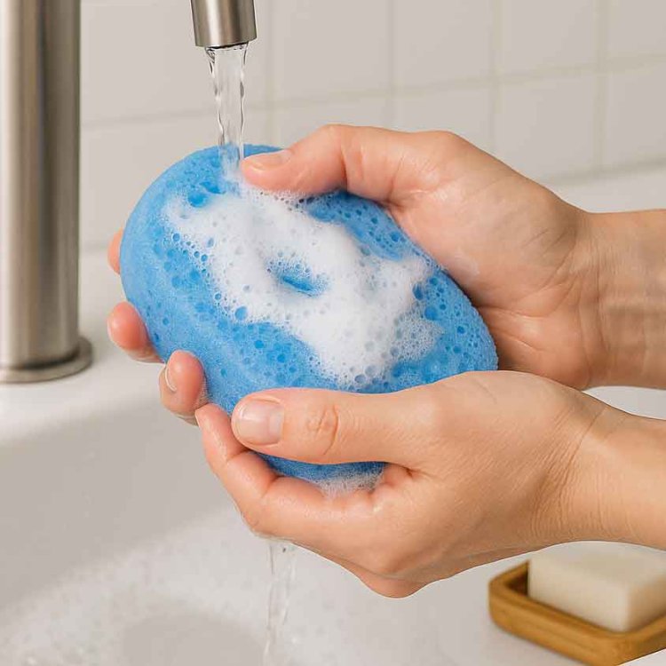 3. Gently squeeze the sponge to create a rich lather. The soft and porous texture of the sponge helps distribute the soap evenly.