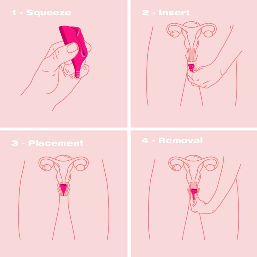 Wash your hands before using your Lily Cup. Submerge cup in boiling water for 5-8 min before first use. Fold cup by pushing the front rim of the cup down and in. Angle your cup towards your tailbone and insert it upwards until the ring is inside. Gently squeeze the base of the cup then rotate slightly to create the seal. Empty your cup 2-3 times per 24 hour period, as needed.