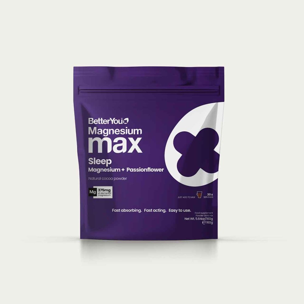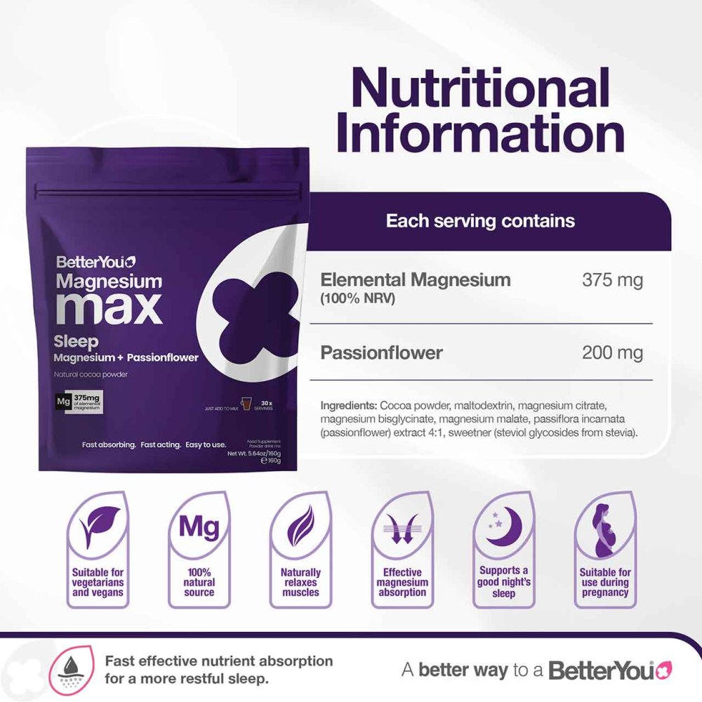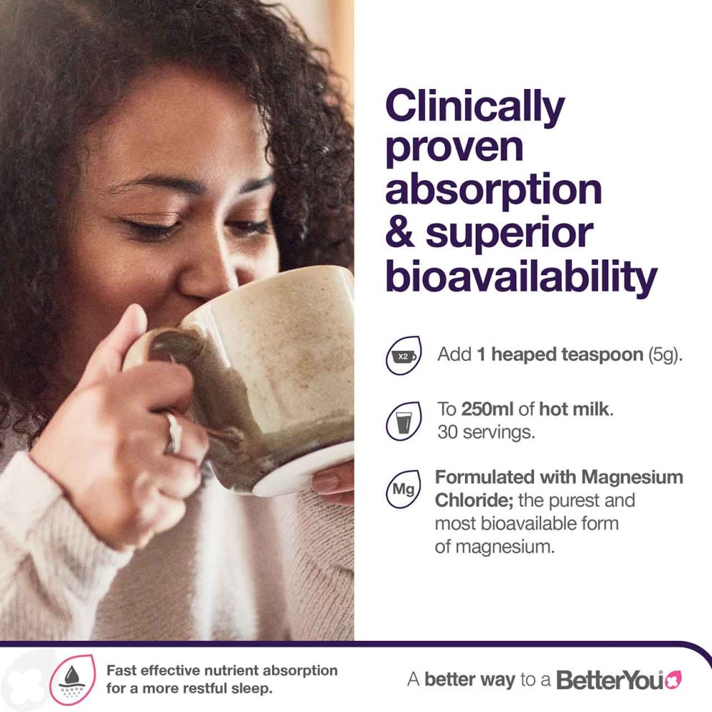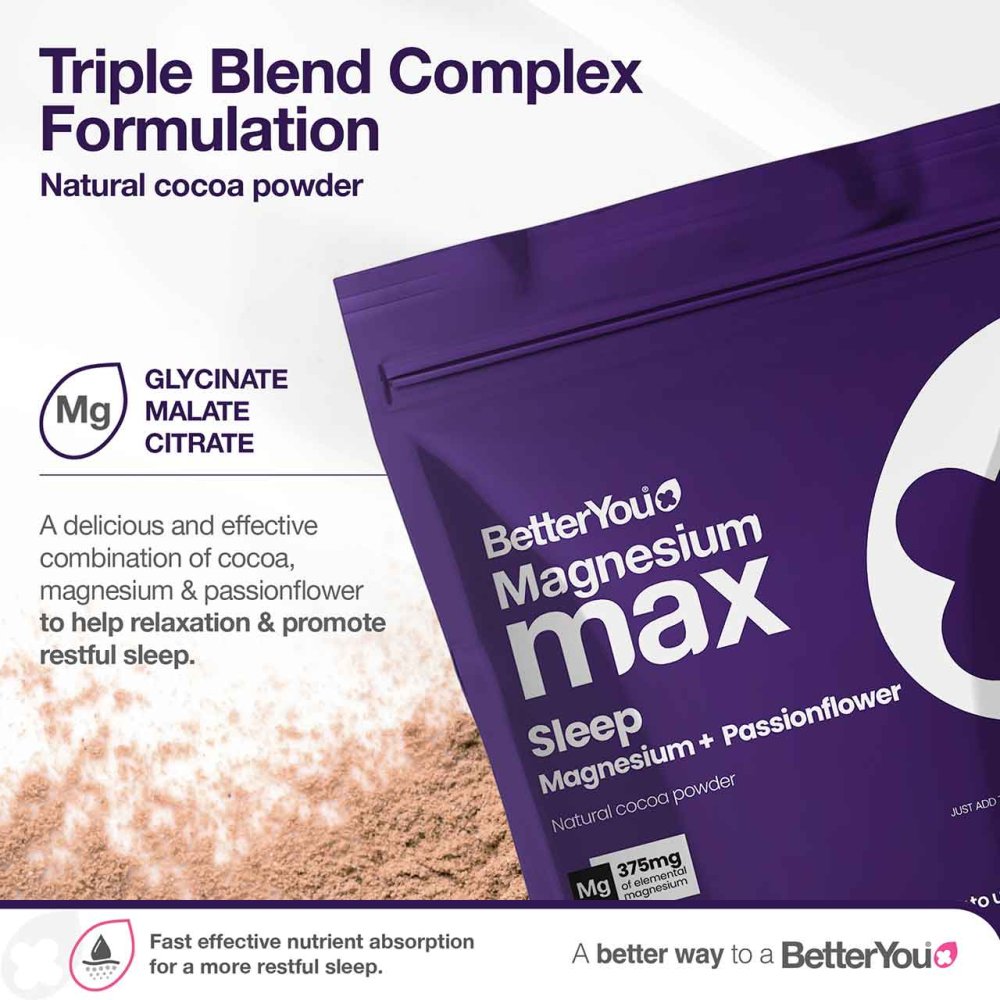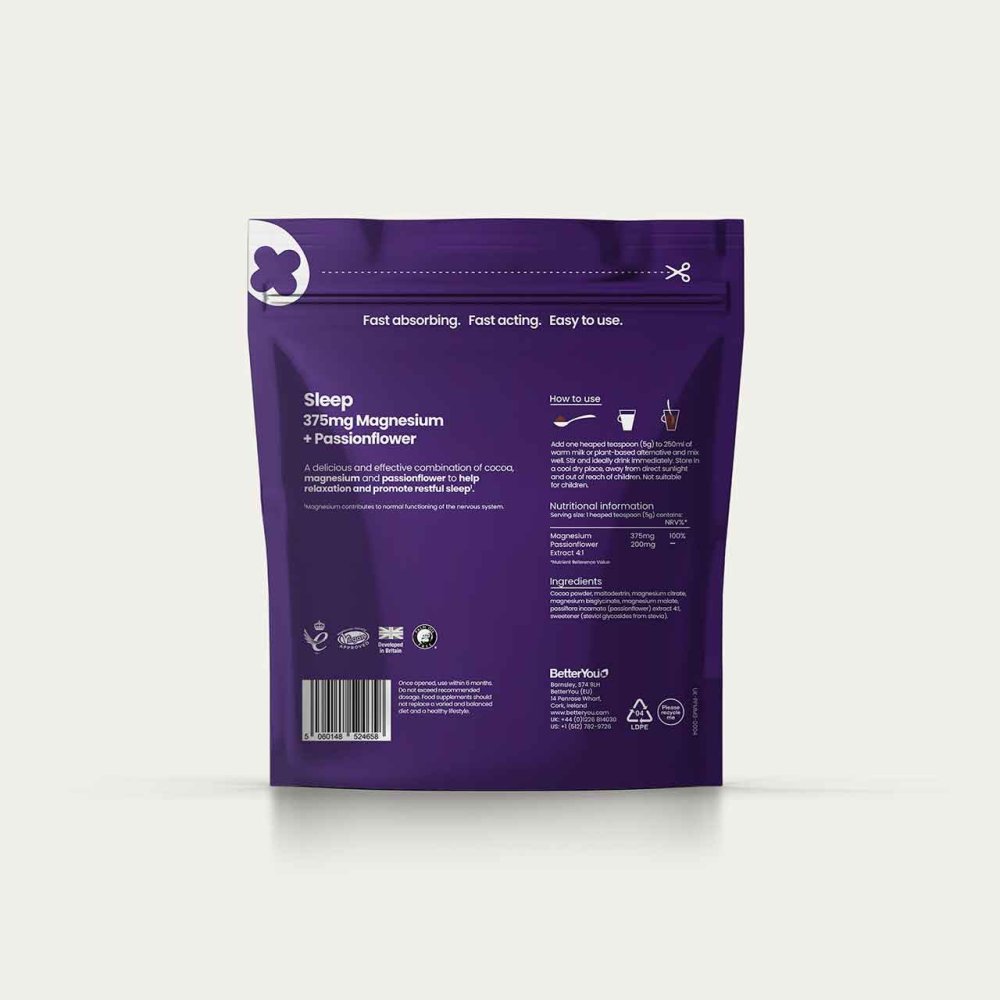 BetterYou Magnesium Sleep Powder is a fast-acting nighttime supplement providing 375mg of elemental magnesium per serving from a carefully balanced blend of magnesium glycinate, citrate and malate, enhanced with natural cocoa powder and passionflower. Scientifically developed, it helps reduce tiredness and fatigue, support relaxation, and contribute to the normal functioning of the nervous system, promoting a deeper, more restful sleep.
