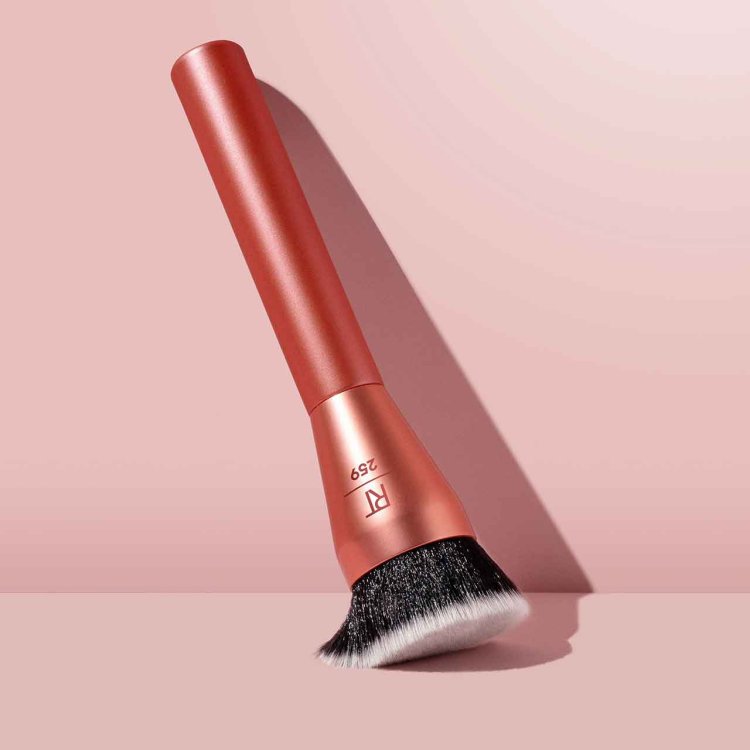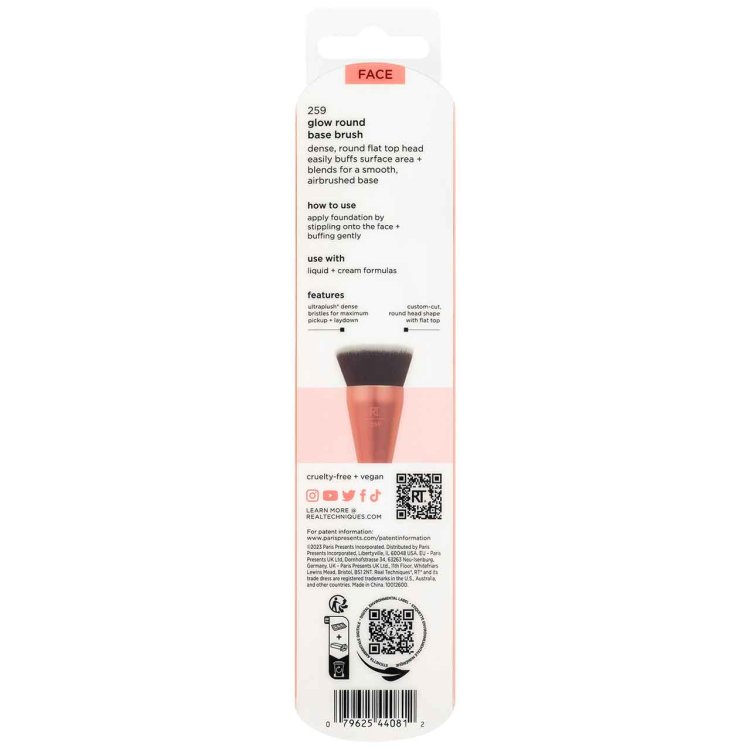 Get that smooth, airbrushed look with the Real Techniques Glow Round Base Brush. Designed with a custom-cut, flat-top round head, this dense foundation brush buffs and blends liquid and cream products effortlessly for full coverage and a seamless glow. Whether you're smoothing on foundation or primer, the 259 brush ensures precise application across the face and neck-even in those tricky areas.