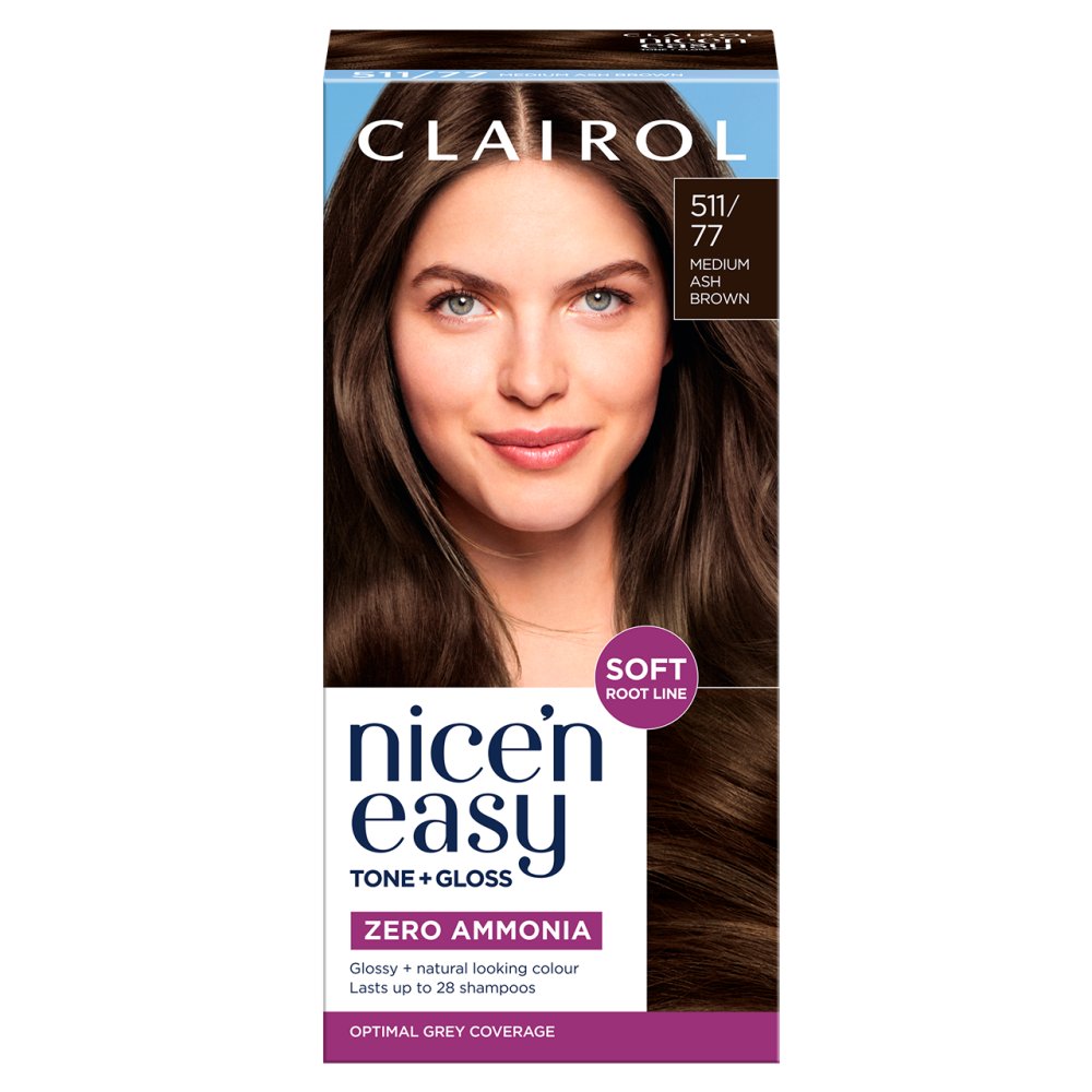 Clairol’s Nice’n Easy Tone + Gloss in 511/77 Medium Ash Brown delivers a calm, muted tone with a modern finish. The conditioning formula leaves hair soft, shiny and cool-toned, without harsh regrowth or damage.
