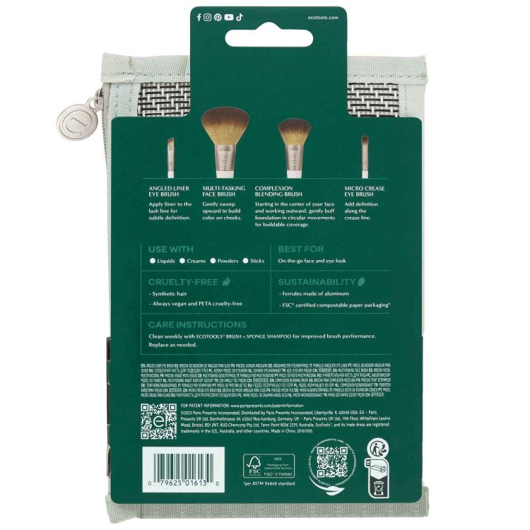 Take your beauty routine anywhere with the EcoTools On-The-Go Style Kit, featuring four essential eye brushes, three beauty look cards, and a compact pocket cosmetic case for easy storage. Designed for travel, these miniature brushes fit perfectly in the case, making touch-ups simple wherever you go.