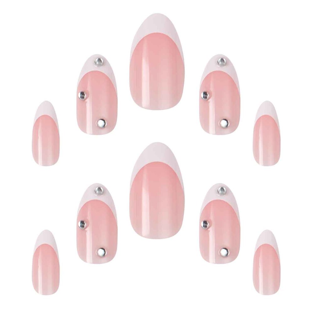For when you want a little extra, Elegant Touch French 128 offers a beautifully pink-hued French manicure in a chic short stiletto shape with a glossy finish. Delicate silver gem embellishments add just the right touch of sparkle, creating a standout look with minimal effort. Designed for a salon-sculpted fit, these nails provide comfortable wear, easy application, and long-lasting results—perfect for elevating both everyday style and special occasions.