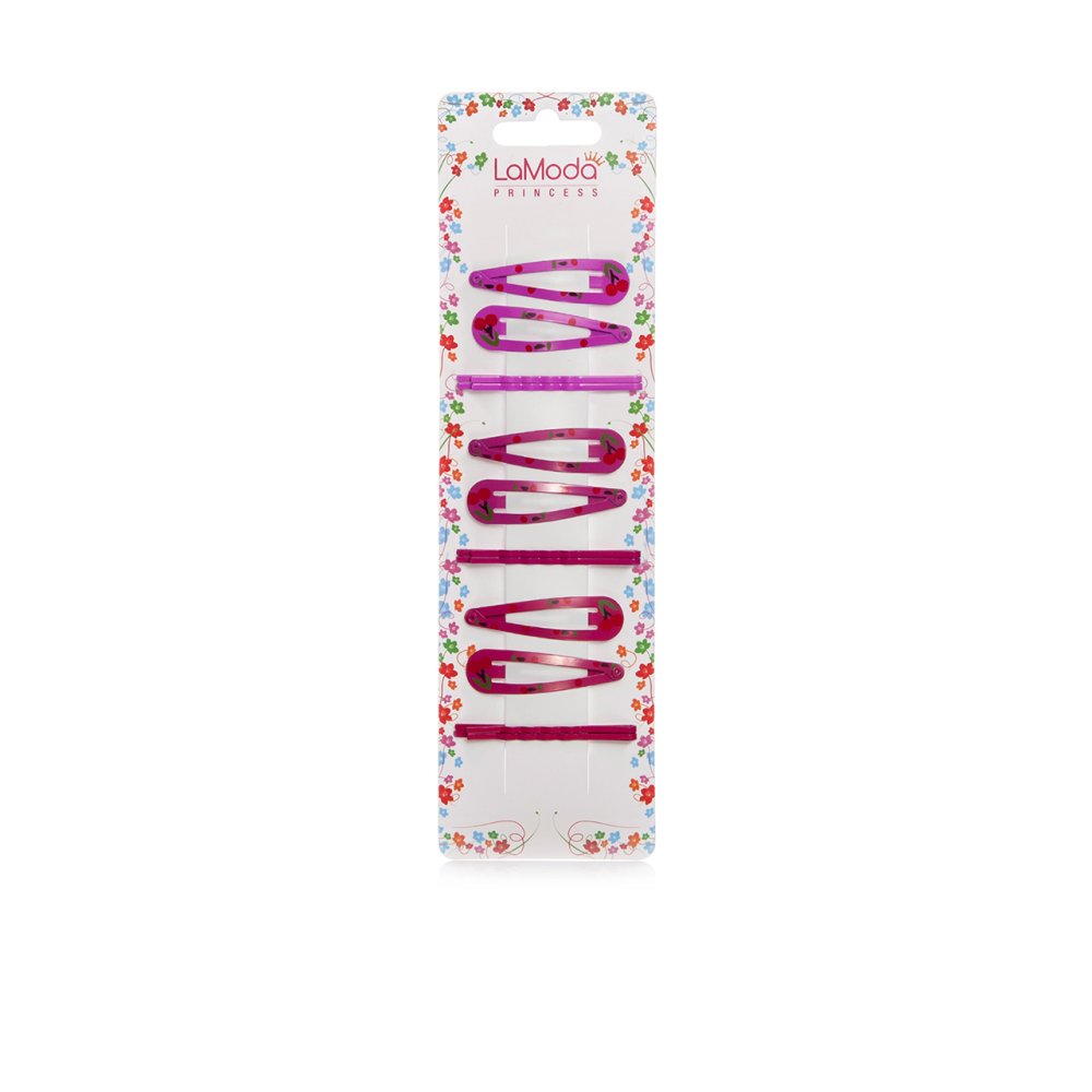 This comprehensive set contains 6 pink hair clips featuring a delightful cherry print design, along with 6 hair grips in various shades of pink, providing a variety of styling options for children's hair.