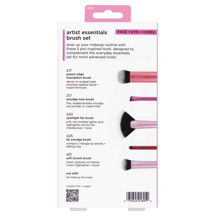 Build your brush collection with the Real Techniques Artist Essentials Set - five premium synthetic fiber brushes designed to create flawless, professional looks. These soft, seamless-blending brushes work beautifully with powder, liquid, and cream formulas. From precise foundation application to smudging liner and blending lip colour, this set covers all your makeup essentials for an elevated, polished finish.
