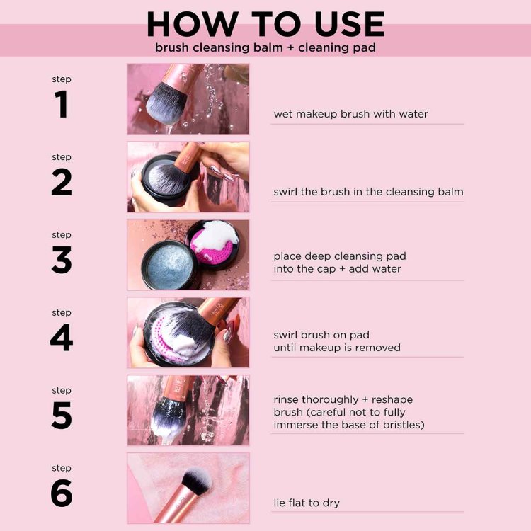 Swirl brush head into the cleansing balm for full coverage. Place deep cleansing pad into the cap and add warm water. Swirl bristles onto until makeup waste is removed. Careful not to immerse base of bristles. Reshape and dry flat or upside-down.