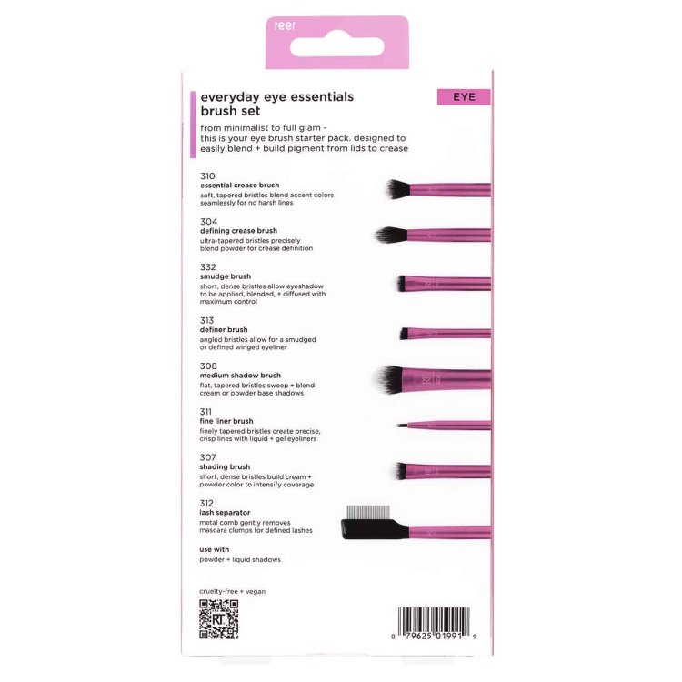 Includes 8 brushes: RT 307 Shading, RT 310 Essential Crease, RT 304 Defining Crease, RT 313 Definer, RT 332 Smudge, RT 308 Medium Shadow, RT 312 Lash Separator, and RT 311 Fine Liner