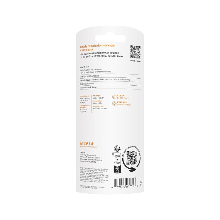 The Real Techniques Miracle Complexion Sponge is a 3-in-1 multi-functional blending sponge, perfect for applying foundation-especially liquid formulas. Use the rounded sides to blend large areas, the precision tip to cover blemishes and imperfections, and the flat edge to contour around eyes and nose for a smooth, enhanced, and gorgeous complexion. Use damp for a dewy glow or dry for full coverage. Keep your sponge fresh by spot cleaning every 1-3 uses, and store it in a dry, well-ventilated area.