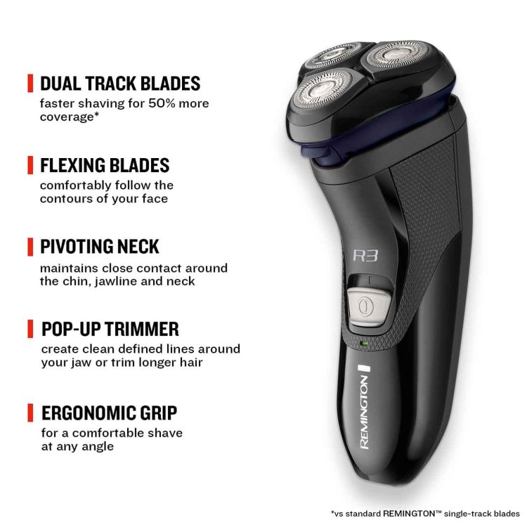 The Remington R3 Style Series Rotary Shaver is built for everyday performance, whether you're maintaining a clean shave or shaping up stubble. Dual Track Blades deliver efficient cutting, while flexing heads and a pivoting neck keep close contact around the contours of your face, chin, and jawline for a comfortable shave.