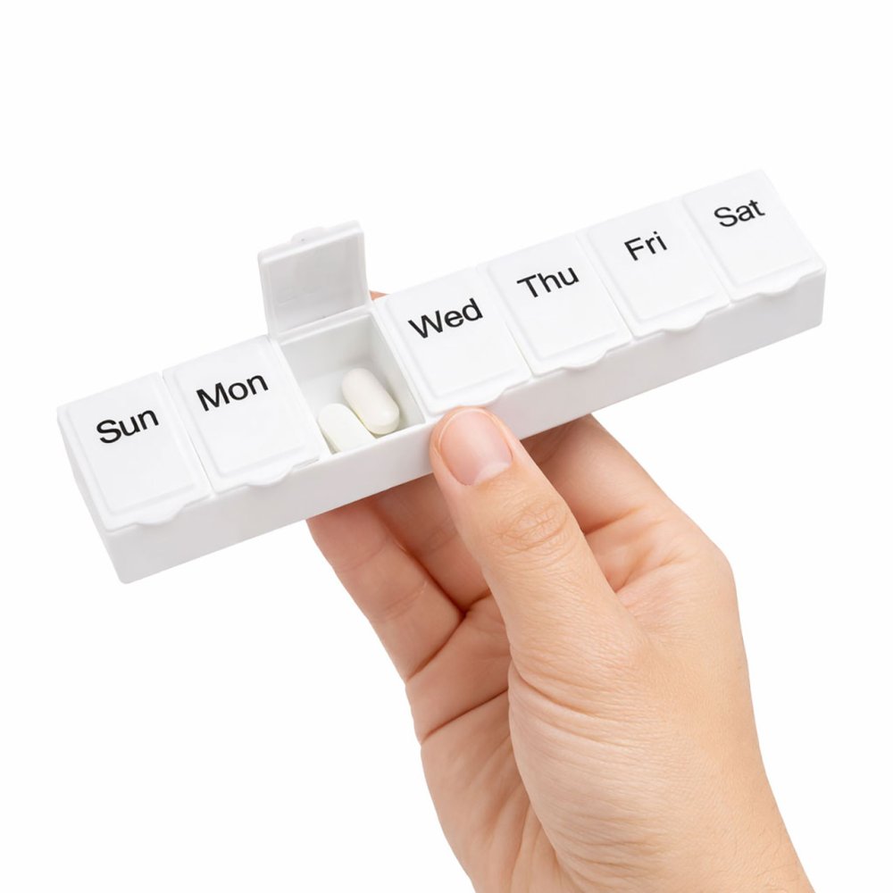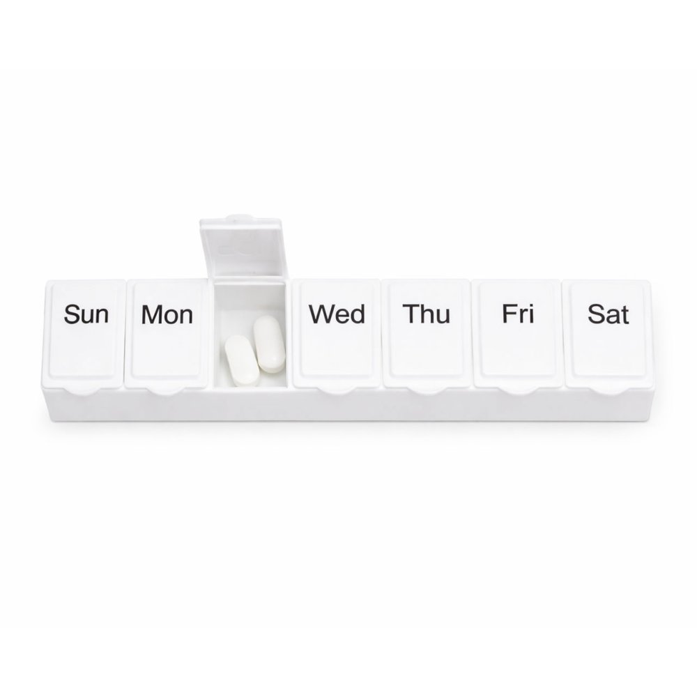 An easy and reliable way to keep track of your daily medication or vitamins. This simple yet effective weekly pill organiser features seven compartments—one for each day of the week—clearly labelled and marked with braille for accessibility. Compact and portable, it’s ideal for use at home, at work, or while travelling.