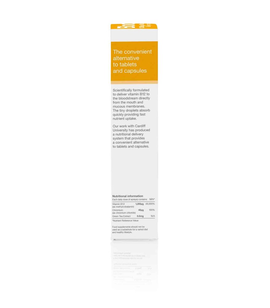 Each dosage (4 sprays) delivers 1200?g (micrograms) of vitamin B12 along with 40?g (micrograms) of chromium and 0.5mg of green tea extract.