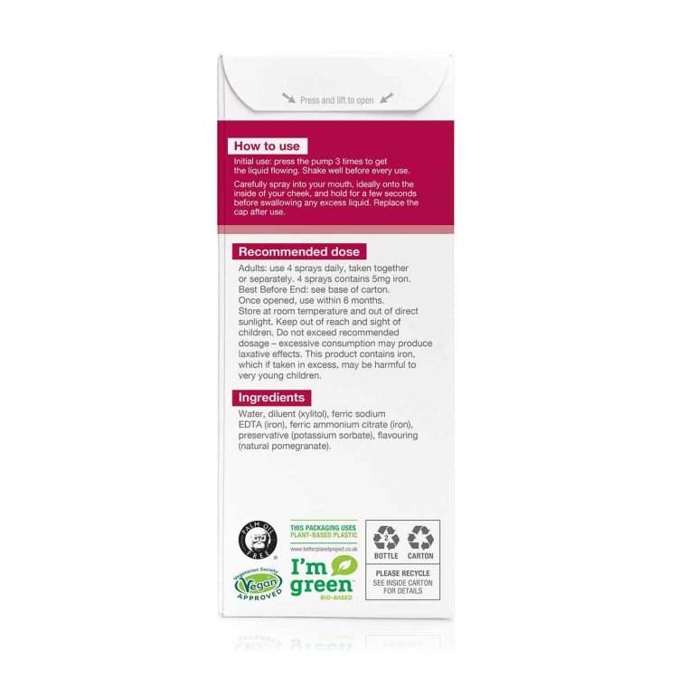 | Ingredients | Water, diluent (xylitol), ferric sodium EDTA (iron), ferric ammonium citrate (iron), preservative (potassium sorbate), flavouring (natural pomegranate). Active ingredient: Ferric Sodium EDTA / Ferric Ammonium Citrate Gluten Free No artificial colours No artificial flavours No fillers No GMO No Alcohol This product has been certified palm oil and palm oil derivative free by The International Palm Oil Free Certification Trademark (POFCAP). |