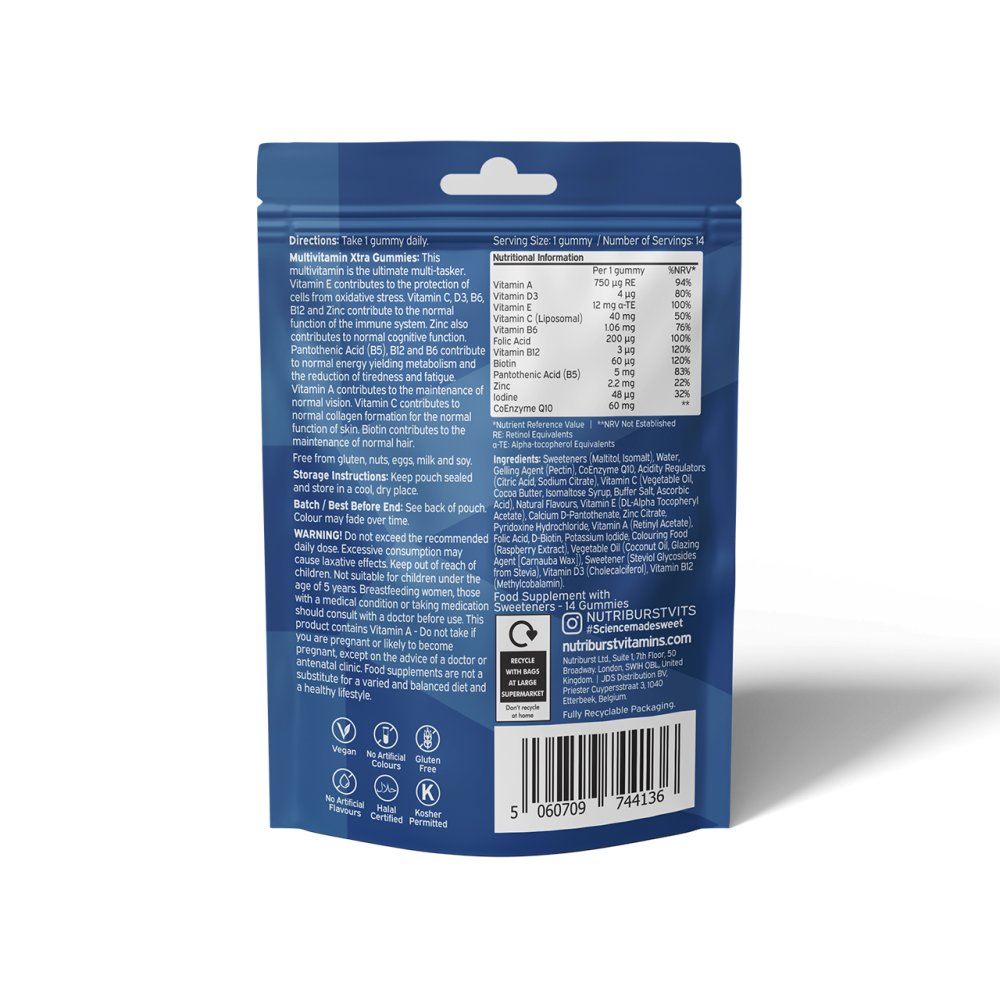 Boost your daily wellness with Multivitamin Xtra Gummies. Each gummy is packed with essential vitamins and minerals to support your body from head to toe. Vitamins C, D3, B6, B12, and Zinc help maintain a healthy immune system, while Vitamin E protects your cells from oxidative stress. Zinc also supports normal cognitive function, and B5, B6, and B12 help your body convert food into energy and reduce tiredness and fatigue. Vitamin A supports healthy vision, Vitamin C promotes collagen formation for skin health, and Biotin helps maintain strong, healthy hair.