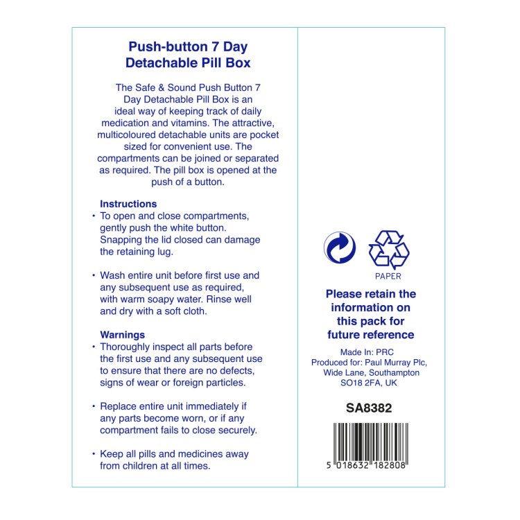 Stay organised and never miss a dose with this Push-Button 7 Day Pill Box. Designed for once-a-day medication needs, it features seven detachable compartments clearly labelled for each day of the week. The push-button mechanism allows quick and easy access to your pills, ideal for those with limited dexterity. Plus, it includes two patient cards for tracking medication schedules and health details, making it perfect for use at home or on the move.