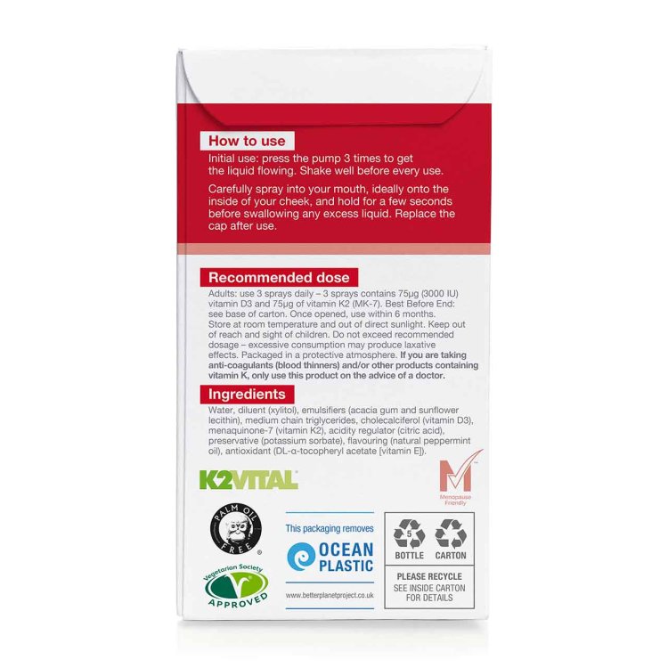 | Ingredients | Water, diluent (xylitol), emulsifiers (acacia gum and sunflower lecithin), menaquinone-7 (vitamin K2), acidity regulator (citric acid), preservative (potassium sorbate), flavouring (natural peppermint oil), cholecalciferol (vitamin D3), antioxidant (DL-?-tocopheryl acetate [vitamin E]). |