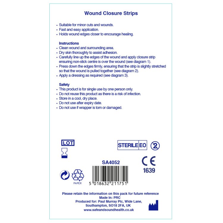 The Safe & Sound Wound Closure Strips are ideal for closing minor cuts and small wounds without the need for stitches. Designed to draw the edges of the wound together, these adhesive strips help reduce the risk of infection while supporting natural healing.